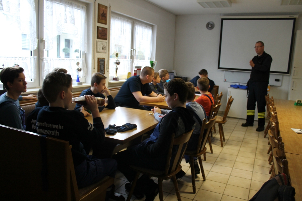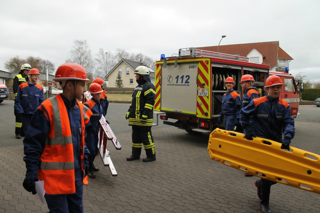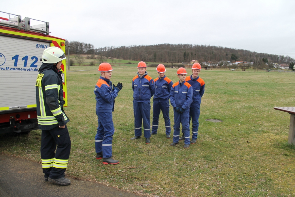 Der Jugendwart Maximilian Bock sich dafür ein abwechslungsreiches Programm einfallen lassen. Das machte den zehn Jugendlichen nicht nur richtig Spaß, sondern bereitete sie nebenbei auch für ihre Zukunft in der Nonnenröther Einsatzabteilung vor. Beim Gartenhüttenbrand mussten sie etwa Saugschläuche kuppeln, um Wasser aus der Wetter zu pumpen. An der Diskothek hingegen gab es einen Oberflurhydranten, aus dem das Löschwasser kam. Und im Sportlerheim merkten die Jugendlichen, dass eine Brandmeldeanlage nicht nur durch Rauch, sondern auch manchmal aus anderen Gründen Alarm schlagen kann – etwa wegen Wasserdampf. Um genügend Platz für alle Jugendfeuerwehrleute und Betreuer zu haben, hatte man das alte Löschfahrzeug aus Hungen zusätzlich ausgeliehen.