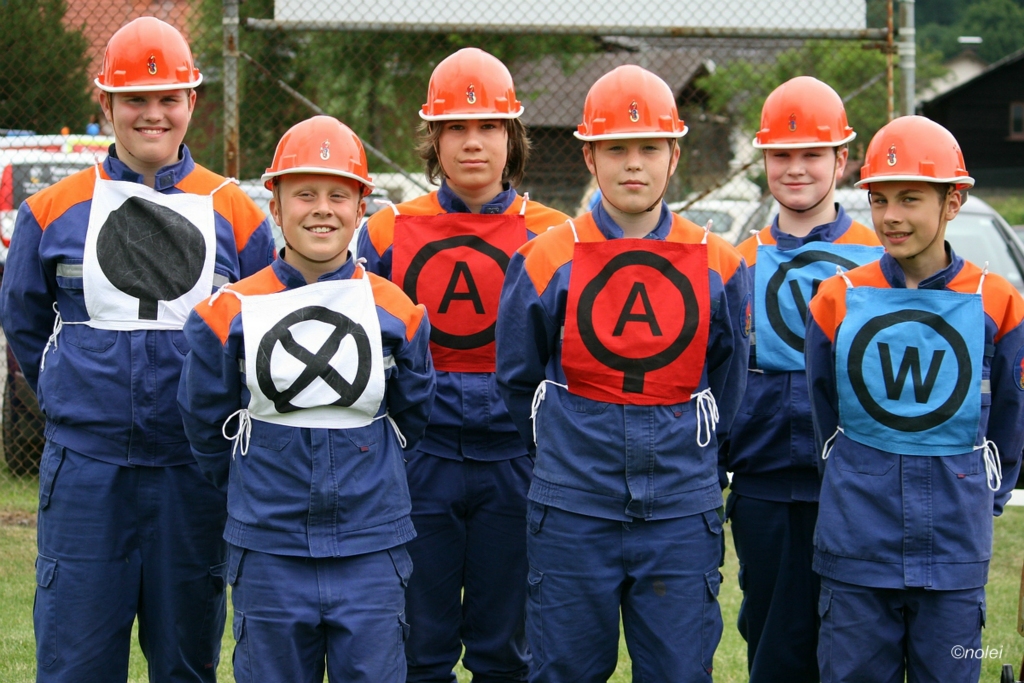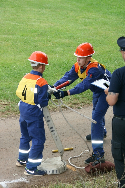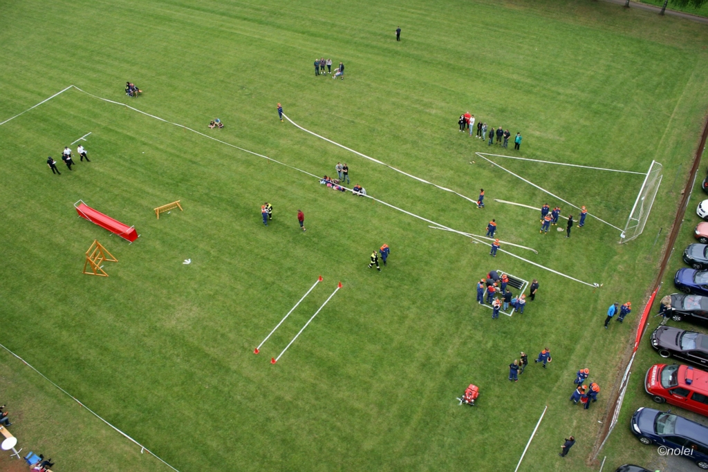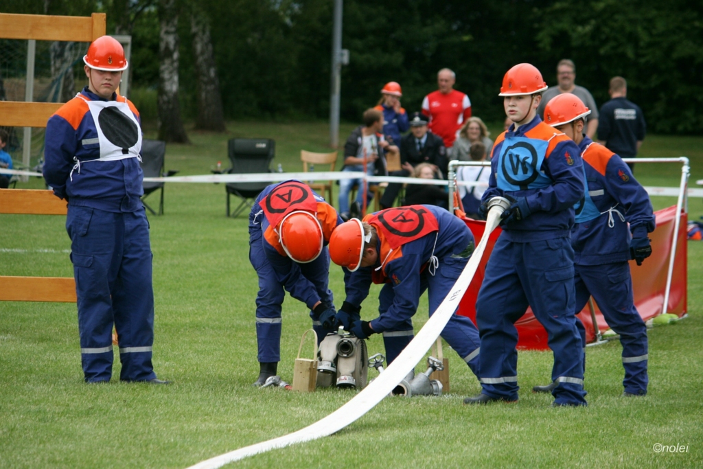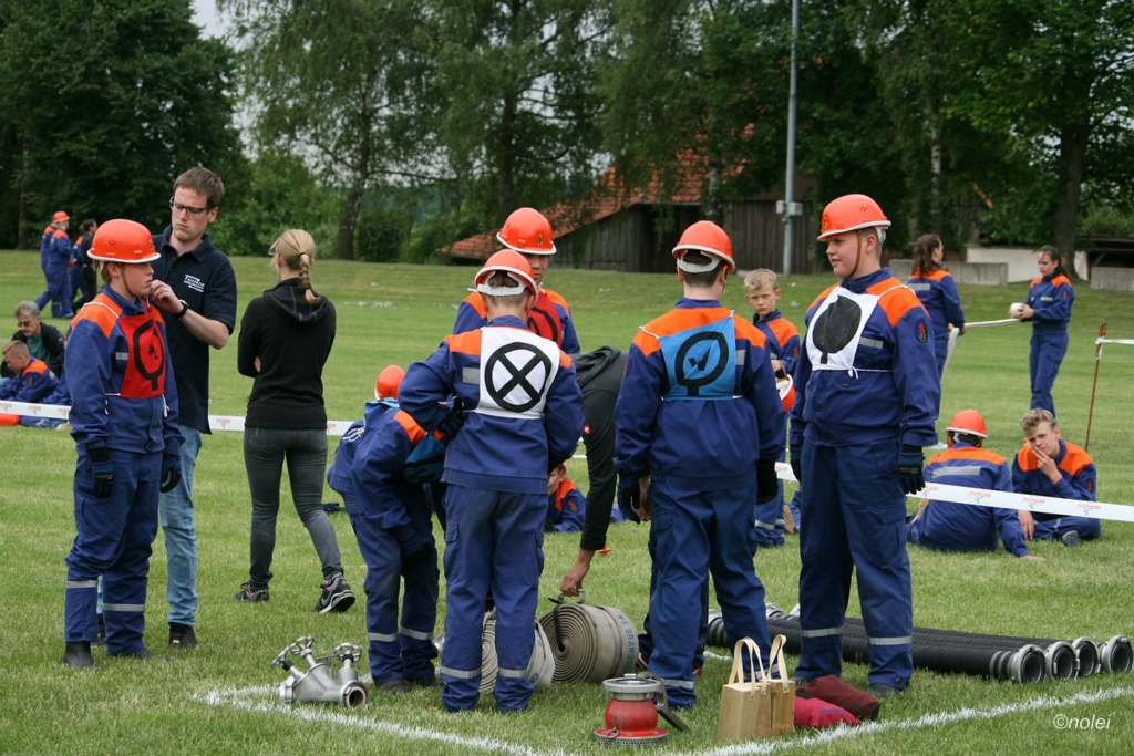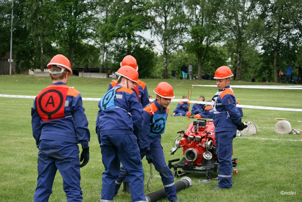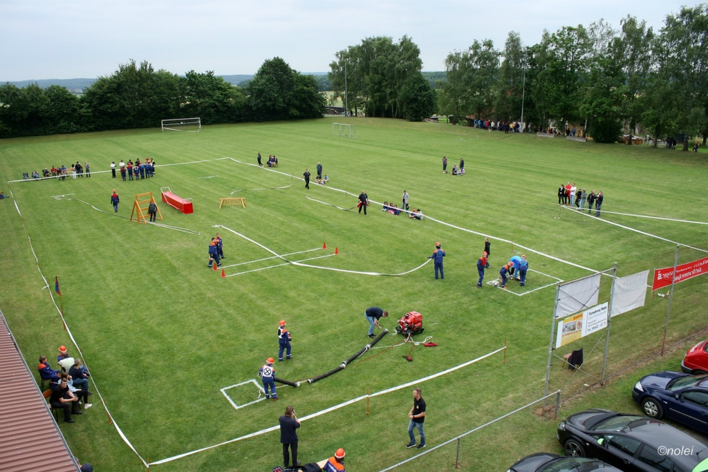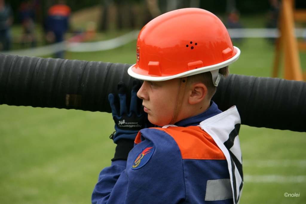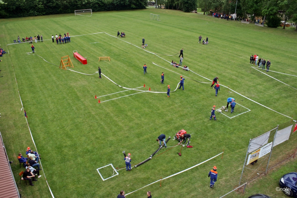 Im A-Teil musste zunächst ein Löschangriff aufgebaut werden. Also die schwarzen Saugschläuche verbinden und an die Pumpe ankuppeln, über einen Wassergraben springen, Schläuche ausrollen, über eine Kletterwand steigen und dann mit dem Strahlrohr in der Hand zum löschen bereit stehen. Dabei muss natürlich alles ordentlich gemacht werden – für Fehler gibt es Punktabzug. Zur Aufgabe zählt auch das binden von vier Feuerwehrknoten. Im B-Teil gibt es dann einen besonderen Staffellauf: Ein Schlauch muss aufgewickelt, ein Strahlrohr angekuppelt und ein Leinenbeutel genau ins Ziel geworfen werden – nachdem die Truppe zusammen 400 Meter gelaufen ist. Die Eltern am Wegesrand, auf dem der B-Teil stattfand, sowie auf dem Nonnenröther Sportplatz, wo der Löschangriff aufgebaut wurde, feuerten zusammen mit Freunden und Geschwistern die jungen Feuerwehrsportler an. Am Ende des Samstags konnte Nonnenroth den Wanderpokal in Empfang nehmen.