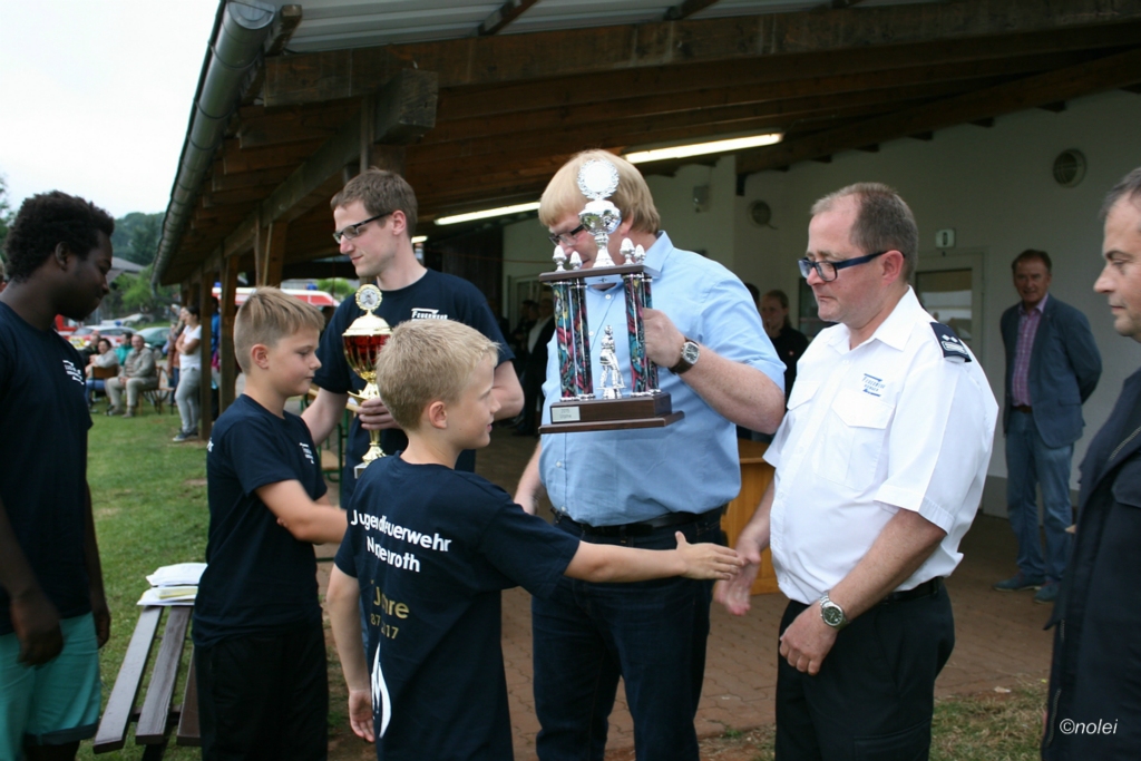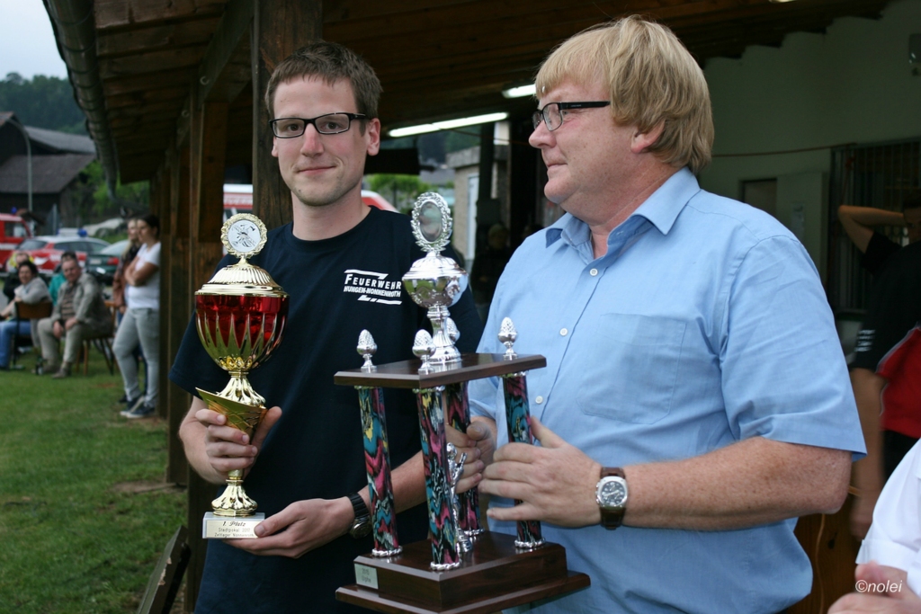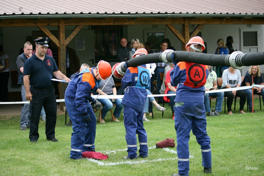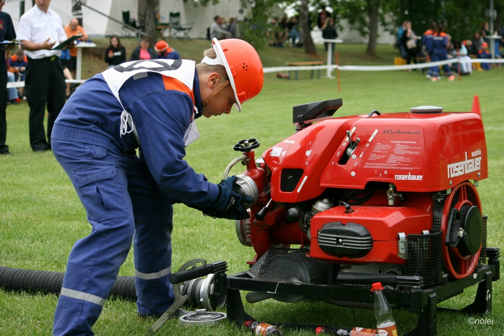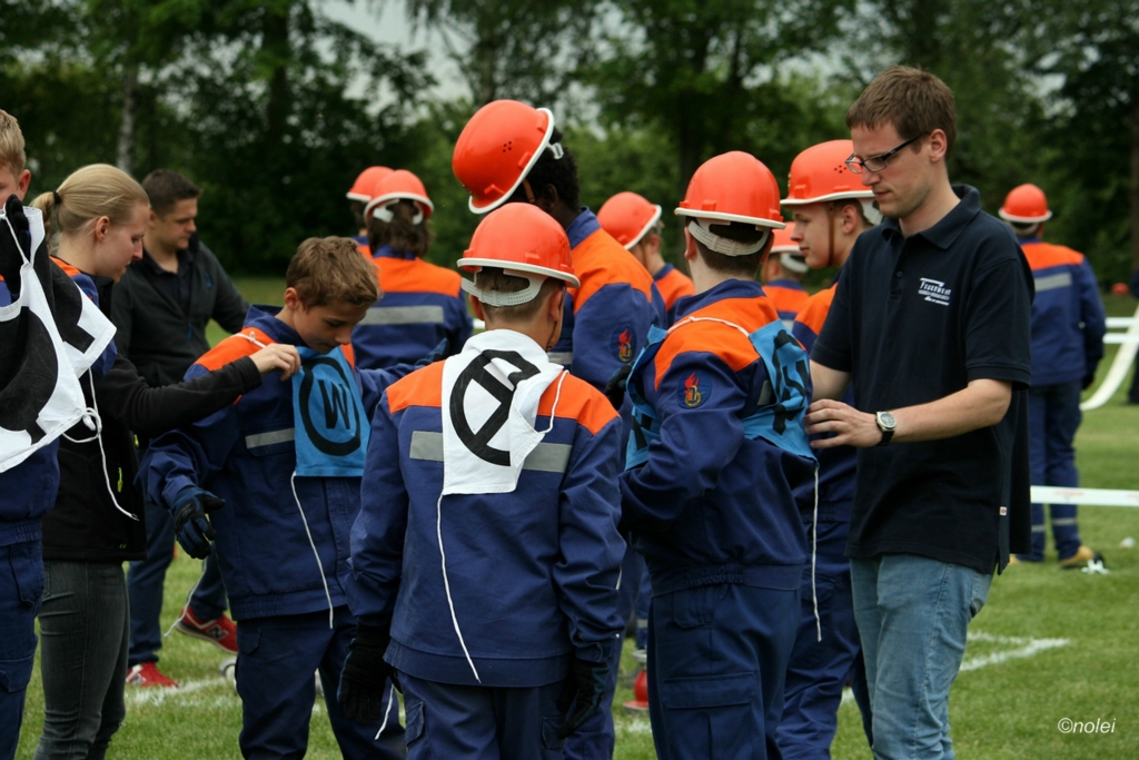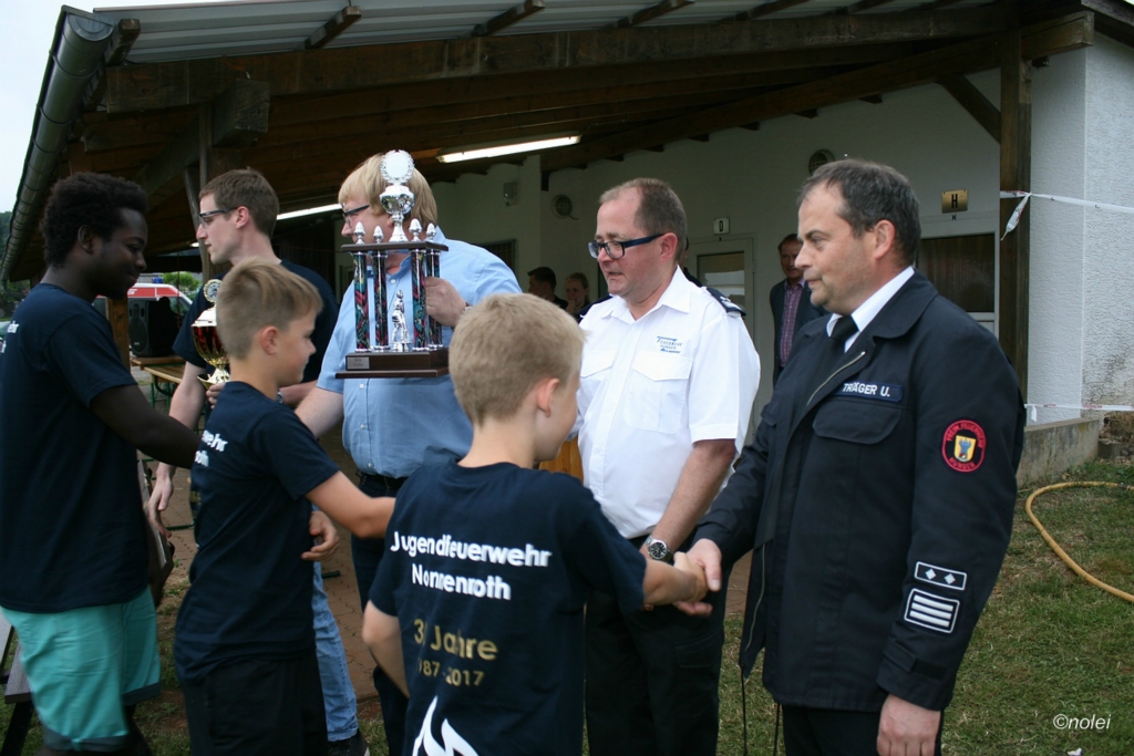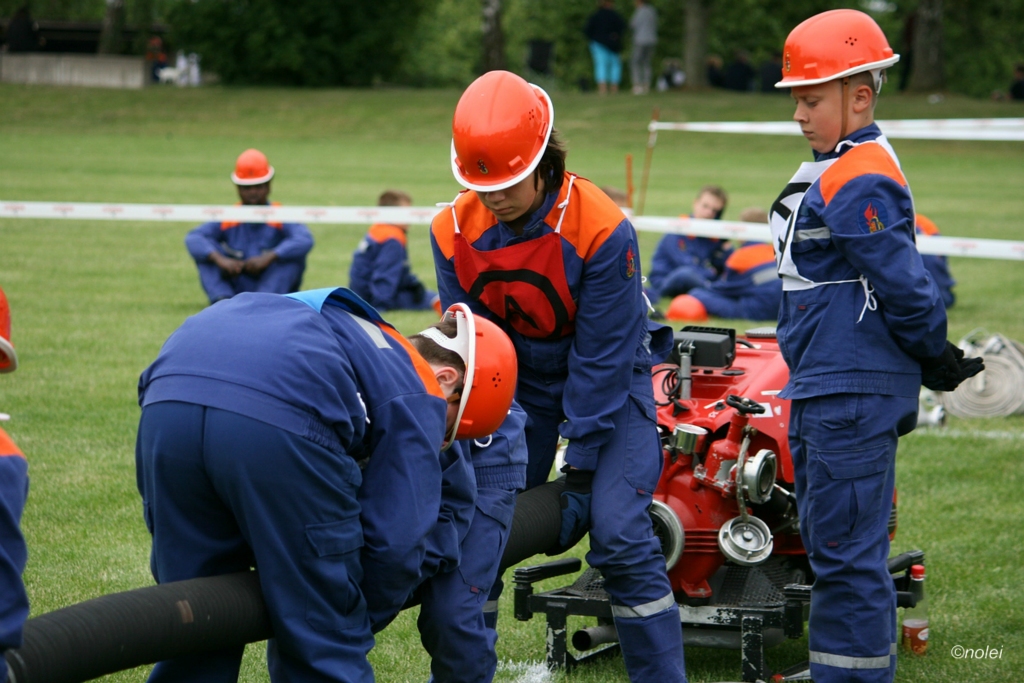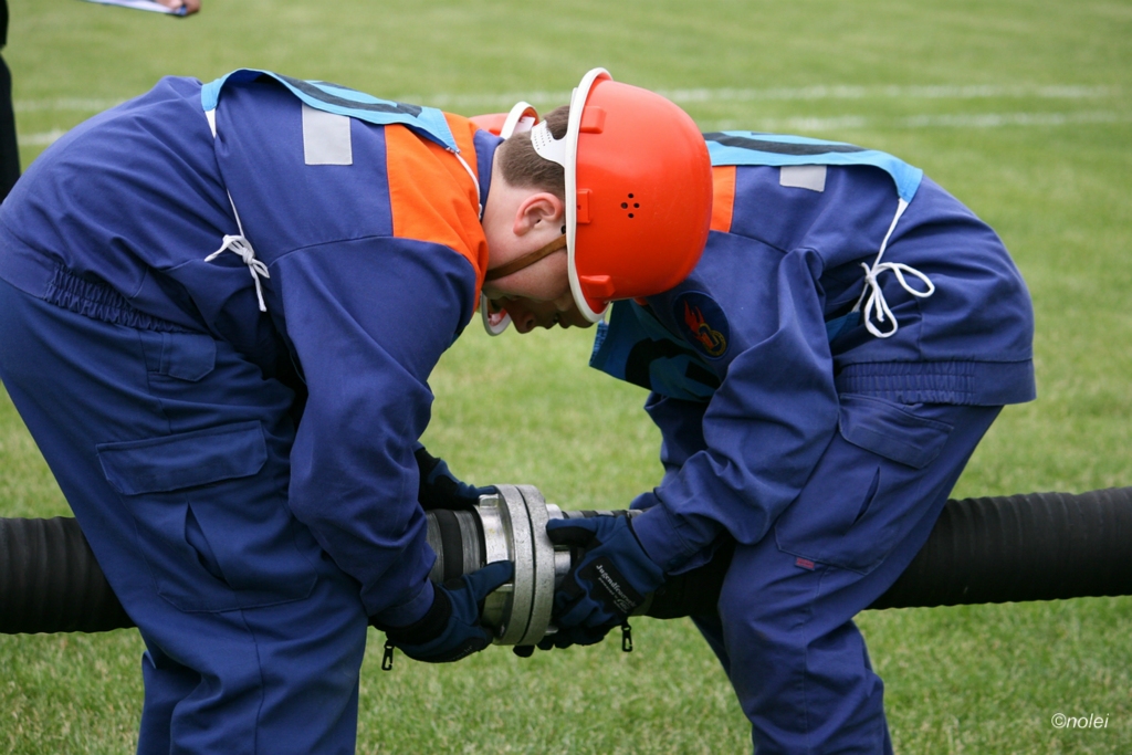 Im A-Teil musste zunächst ein Löschangriff aufgebaut werden. Also die schwarzen Saugschläuche verbinden und an die Pumpe ankuppeln, über einen Wassergraben springen, Schläuche ausrollen, über eine Kletterwand steigen und dann mit dem Strahlrohr in der Hand zum löschen bereit stehen. Dabei muss natürlich alles ordentlich gemacht werden – für Fehler gibt es Punktabzug. Zur Aufgabe zählt auch das binden von vier Feuerwehrknoten. Im B-Teil gibt es dann einen besonderen Staffellauf: Ein Schlauch muss aufgewickelt, ein Strahlrohr angekuppelt und ein Leinenbeutel genau ins Ziel geworfen werden – nachdem die Truppe zusammen 400 Meter gelaufen ist. Die Eltern am Wegesrand, auf dem der B-Teil stattfand, sowie auf dem Nonnenröther Sportplatz, wo der Löschangriff aufgebaut wurde, feuerten zusammen mit Freunden und Geschwistern die jungen Feuerwehrsportler an. Am Ende des Samstags konnte Nonnenroth den Wanderpokal in Empfang nehmen.