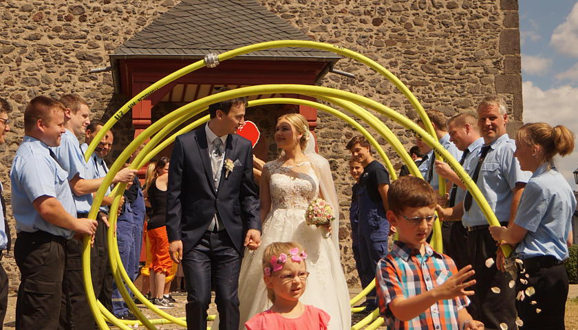 Ein großes Spalier erwartete das frisch getraute Paar vor der Nonnenröther Kirche: Stefan und Tanja Leipold geb. Skorpil gaben sich nun vor Pfarrer Hartmut Lemp das Jawort. Vor der Kirche standen rund drei Dutzend Feuerwehrleute Spalier, darunter auch die Wehrführer anderer Stadtteile sowie Stadtbrandinspektor Udo Träger. Kein Wunder: Der Bräutigam ist Wehrführer der Freiwilligen Feuerwehr Nonnenroth und außerdem im DCC Nonnenroth aktiv. Der Braut gratulierte der SV Nonnenroth ebenfalls mit einem Spalier. Bevor das Paar das Kirchengelände verlassen konnte, warteten aber noch zwei Aufgaben: Zum einen musste mit der Kübelspritze eine Fallklappe umgespritzt, zum anderen mit der Doppelsäge ein Baumstamm zerteilt werden.
