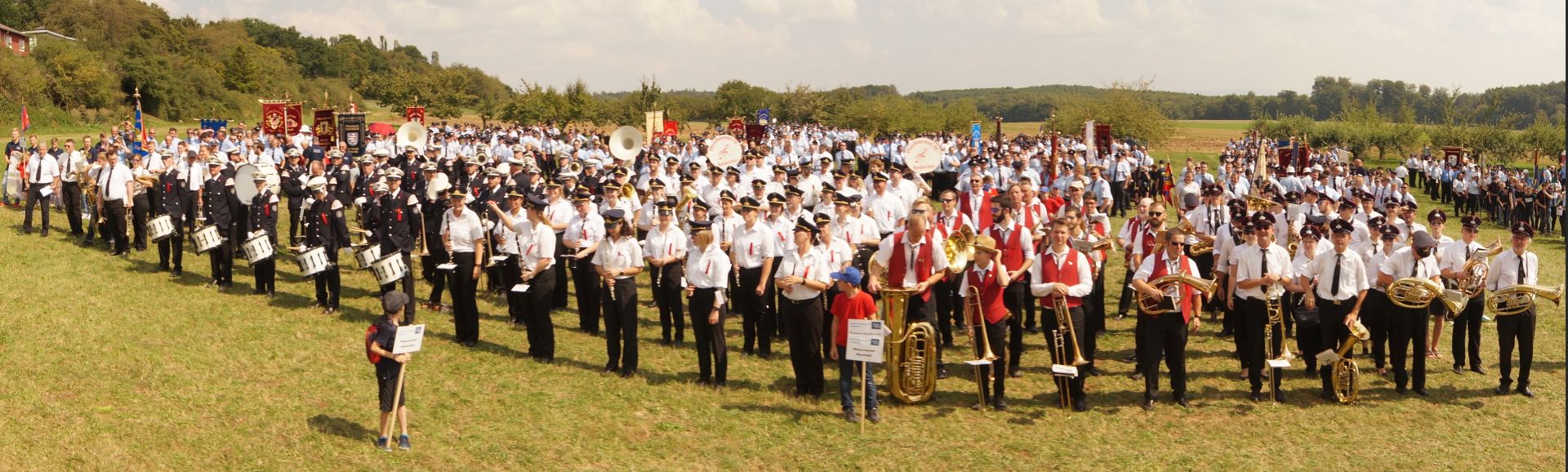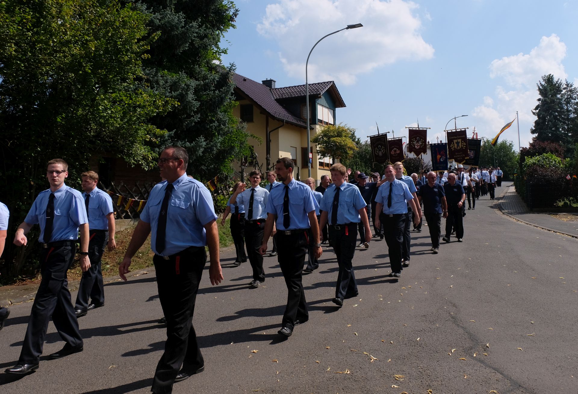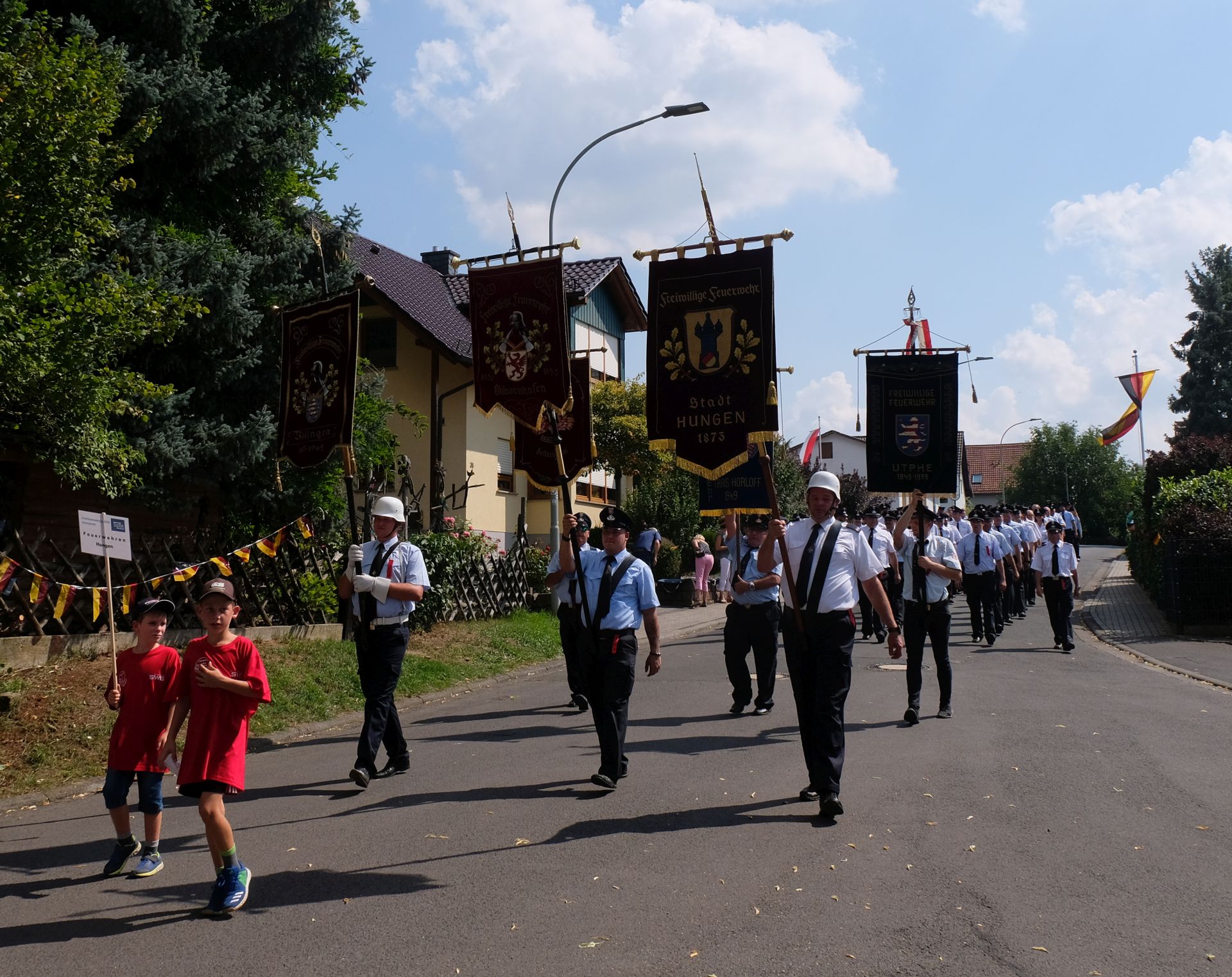 Im Anschluss setzte sich der Festzug durch den Ort in Bewegung. Dieser musste einen Umweg nehmen: Da die Landesstraße nicht gesperrt, sondern nur überquert werden durfte, ging es für ein kurzes Stück über eine Streuobstweise. Der Schatten hier wurde von den Festzugteilnehmern dankbar angenommen. Die Musikgruppen aus Muschenheim, Eberstadt, Reiskirchen, Großen-Linden und Villingen hatten bei den heißen Temperaturen Höchstleistungen zu bringen. Diese wurden von den Zuschauern jedoch mit viel Applaus gewürdigt. Die historische Feuerspritze aus Harbach sorgte für Abkühlung. Im Anschluss an den Festzug wurde im Zelt mit den Mostlandstürmern gefeiert. Um den Brandschutz musste sich an diesem Tag übrigens niemand Sorgen machen: Bereits im Vorfeld war geklärt worden, dass einige zu Hause bleiben, um im Einsatzfall helfen zu können. Sie sind dann beim nächsten Kreisfeuerwehrtag 2020 in Queckborn bestimmt wieder mit dabei.