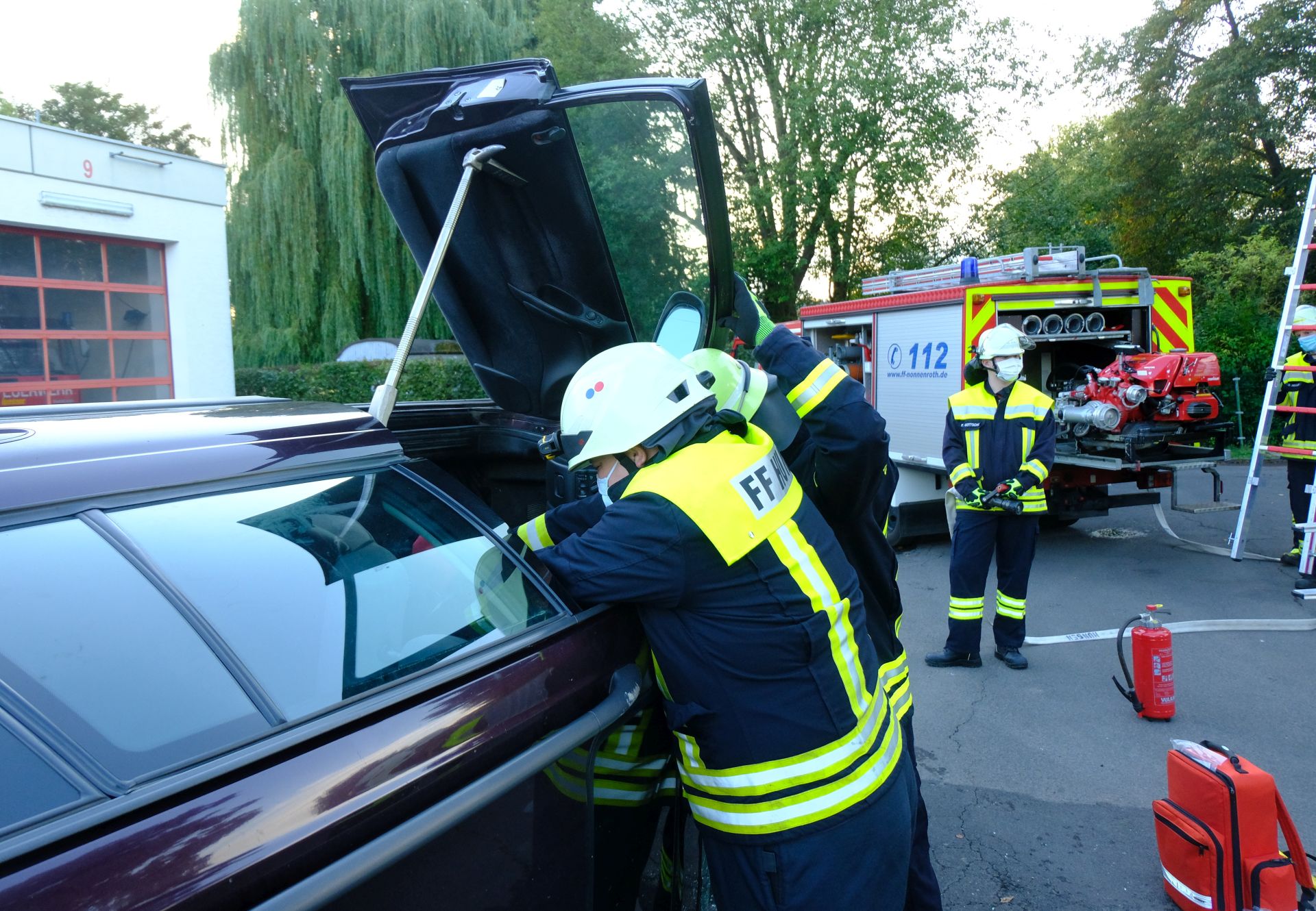 Für zusätzliche Belastung beim Umgang mit den schweren Werkzeugen wie Schere und Spreizer sorgten die Mund-Nasen-Bedeckungen, die aufgrund der Covid-19-Hygienevorschriften während der gesamten Übung getragen wurden.