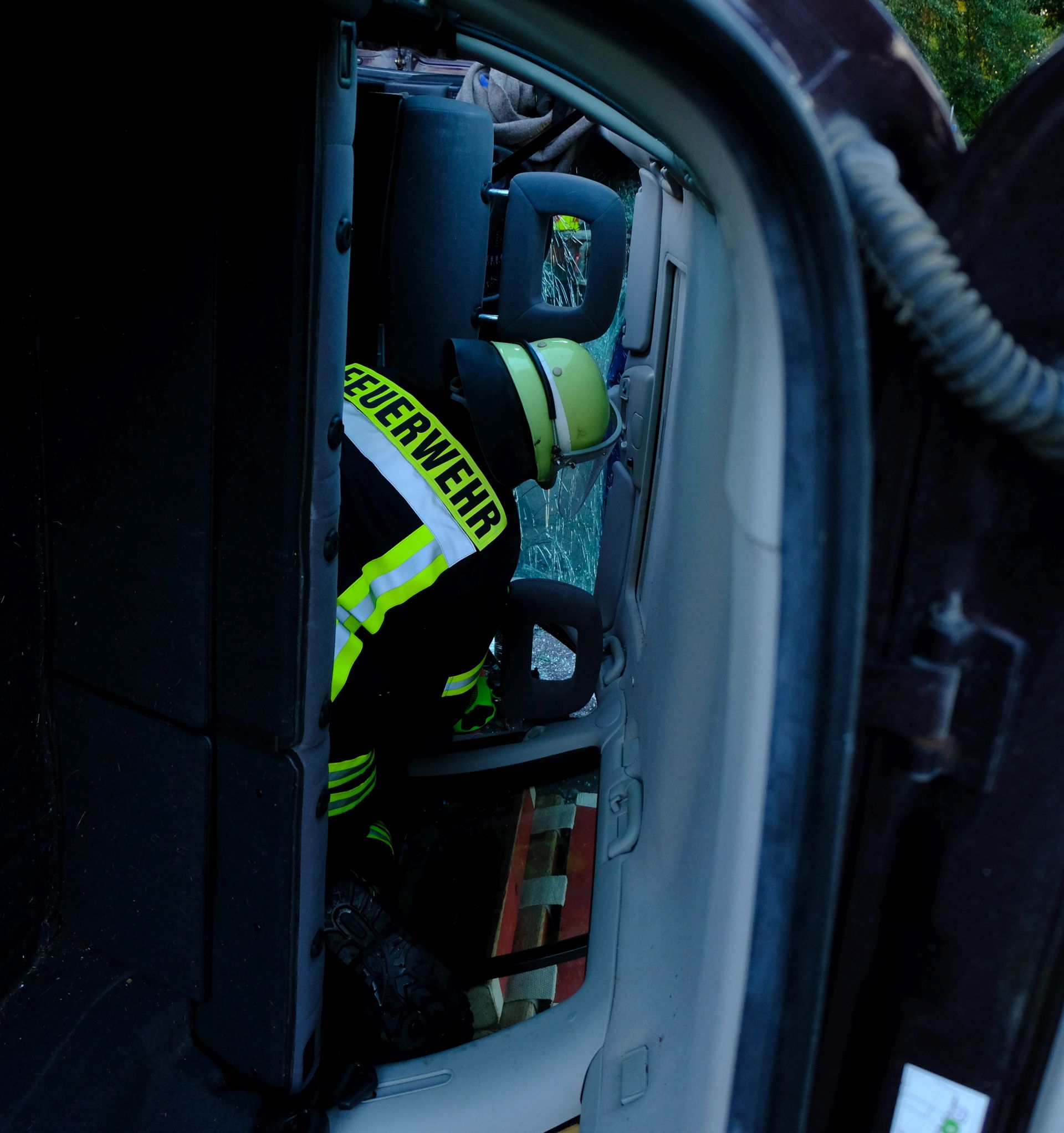 Im Anschluss wurde das Auto auf die Räder gestellt und noch die sogenannte „große Seitenöffnung“ geübt: Damit schafft die Feuerwehr möglichst viel Platz, um einen Verletzten aus einem Auto schonend zu retten. Zunächst wurde die vordere, dann die hintere Tür mittels Spreizer aus der Verankerung gedrückt. Dann wurde die B-Säule mittels Schere durchtrennt. Schließlich wurden die A-, C- und D-Säule des Kombi durchschnitten und das Dach zur Beifahrerseite weggeklappt.