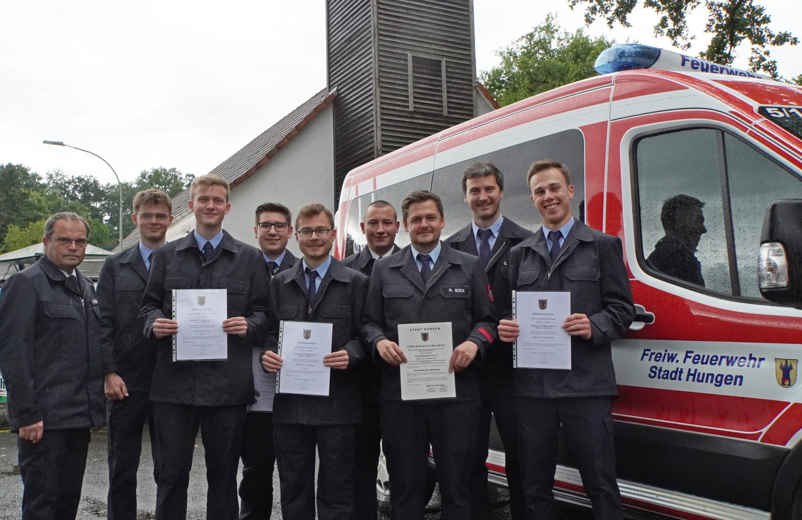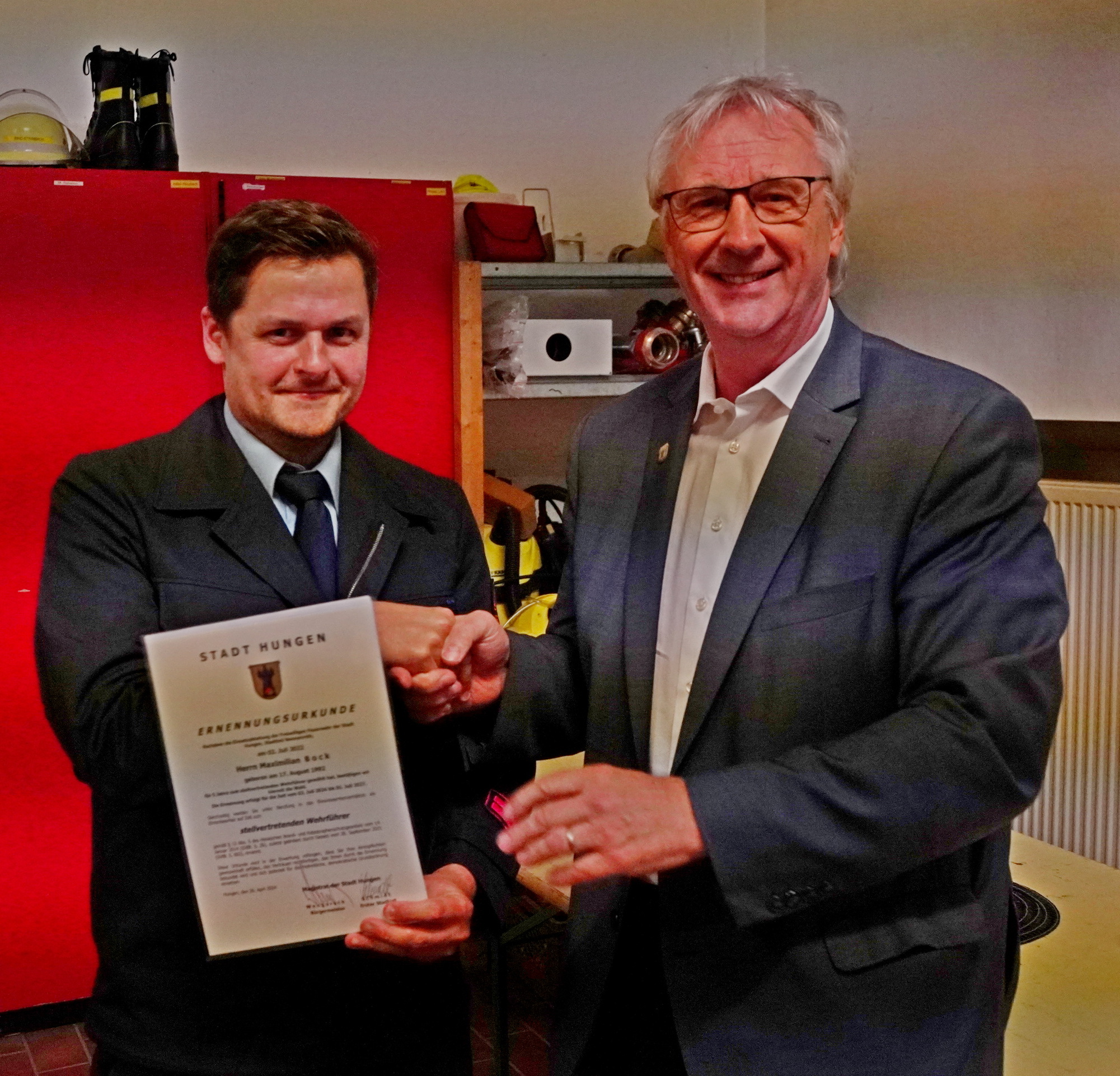 Stadtbrandinspektor Udo träger beförderte Luca-Tom Schkade, Noah Braun und Fynn Hoppe zu Feuerwehrmännern, Noel Hoppe, Justin Hoppe und Jannik Metzger zu Oberfeuerwehrmännern. Maximilian Bock wurde als stellvertretender Wehrführer per Handschlag durch Bürgermeister Rainer Wengorsch ernannt.