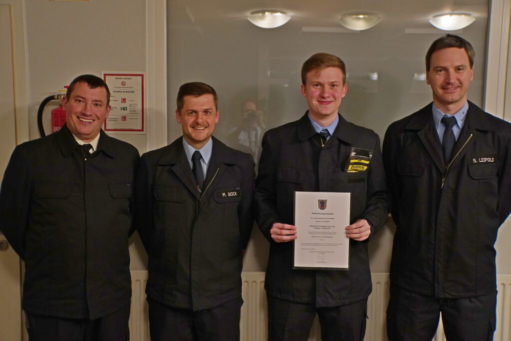 Zehn Lehrgangs- und Seminarbesuche wurden absolviert. Der stellvertretende Stadtbrandinspektor Fabian Schmidt beförderte Fynn Hoppe zum Oberfeuerwehrmann. Fynn Hoppe, Marko Hoppe und Burkhard Hoppe wurden zudem für einen fast vollständigen Übungsbesuch geehrt.
