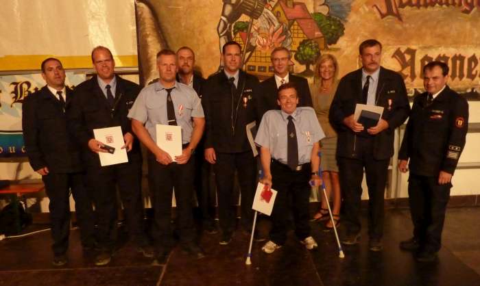 Für 25 Jahre Einsatzdienst wurden Burkhard Hoppe, Markus Metzger und Marko Hoppe mit dem silbernen Brandschutzehrenzeichen, für 40 Jahre Eckehard Fritz und für 40 Jahre der Kamerad Scherer mit dem goldenen Brandschutzabzeichen geehrt.