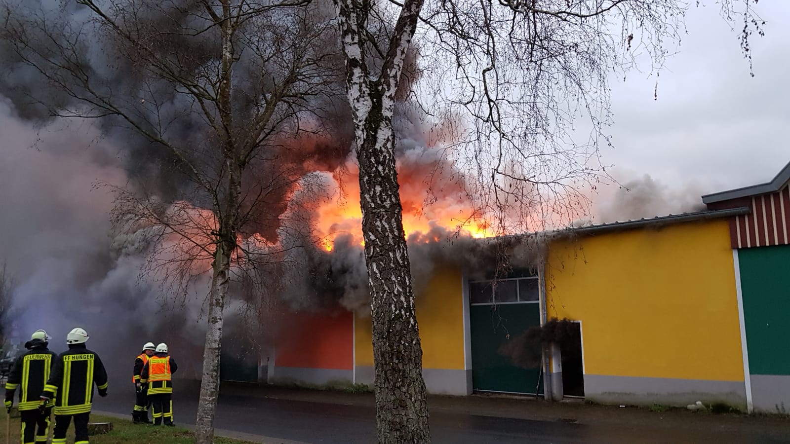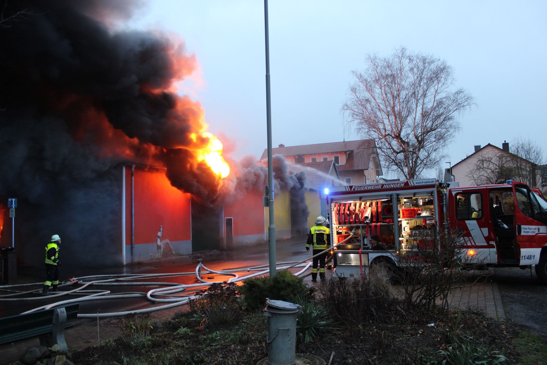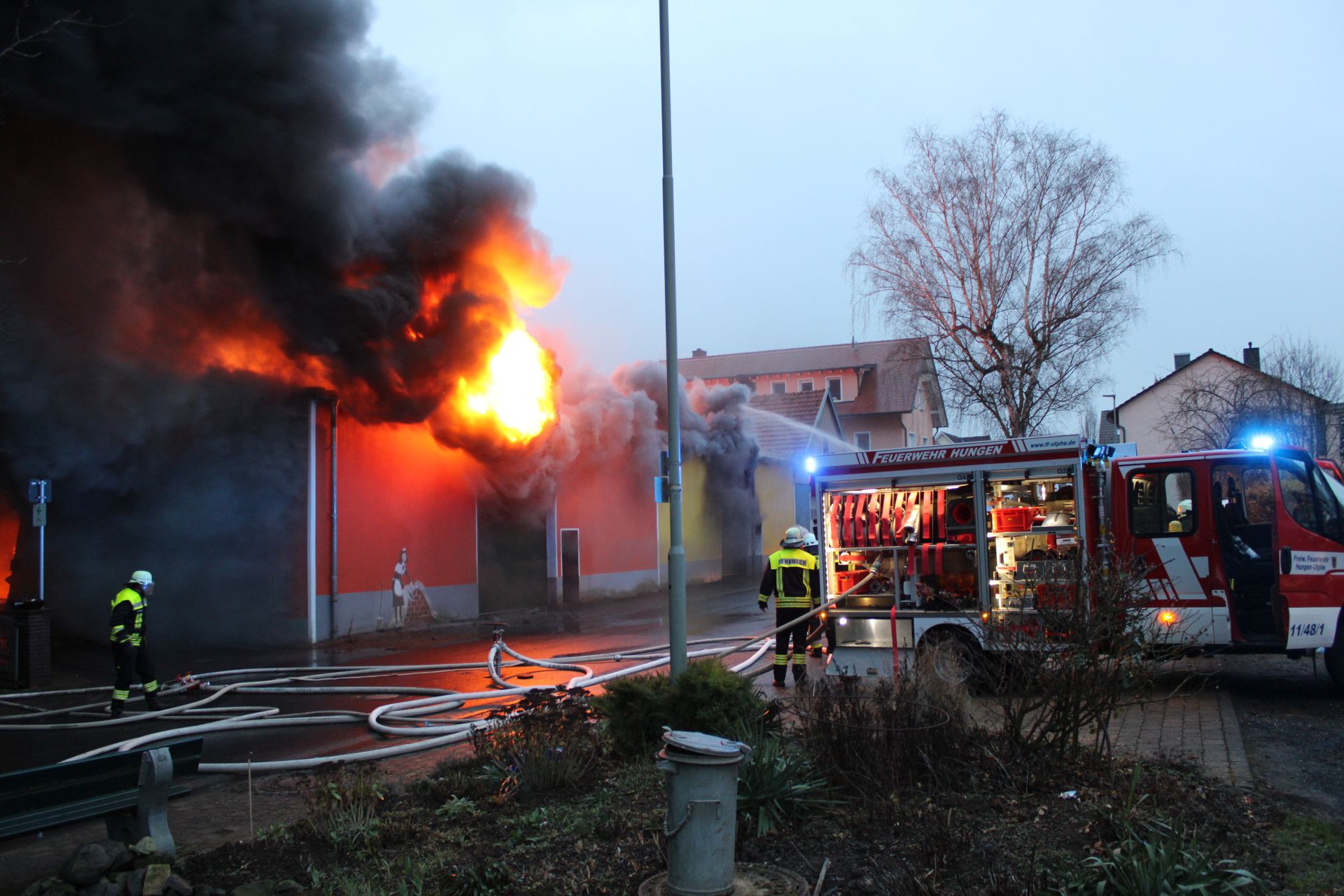 In den Nachmittagsstunden des 4. Januar kam es im Gebäude einer Kfz-Werkstatt in Utphe zu einem Feuer. Aufgrund der Größe des Objekts wurde sofort unter dem Stichwort F3 ein Großaufgebot alarmiert. Alle Hungener Feuerwehren waren im Einsatz. Der Brand hatte sich über das gesamte Gebäude, in dem mehrere Fahrzeuge abgestellt waren, ausgebreitet. Eine schwarze Rauchsäule wies den anrückenden Kräften den Weg. Aus Nachbargebäuden mussten Personen aufgrund des dichten Rauchs in Sicherheit gebracht werden. Mit mehreren Strahlrohren sowie von der Drehleiter aus wurde der Brand bekämpft und ein Übergreifen auf angrenzende Gebäude verhindert. Der Werkstattkomplex selbst brannte bis auf die Grundmauern nieder. In den Abendstunden war das Feuer gelöscht, jedoch loderten immer wieder kleine Brandherde auf, sodass eine Brandwache gestellt wurde. Die Feuerwehr Nonnenroth leistete als Atemschutzreserve des Stadtgebiets bei dem Brand wertvolle Dienste.